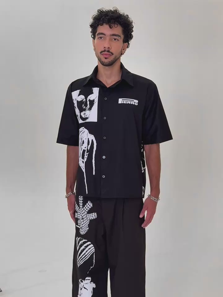Calça de sarja com modelagem reta, tecido 100% algodão. Estampas Retratos aplicadas em Silk.